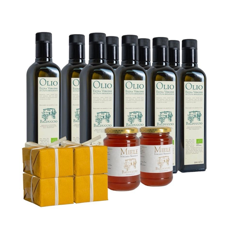 1 Karton mit 9 Halbliterflaschen biologisches Olio Extra Vergine di Oliva 2025, 2 Honiggläser (500 gr) und 12 Seifen